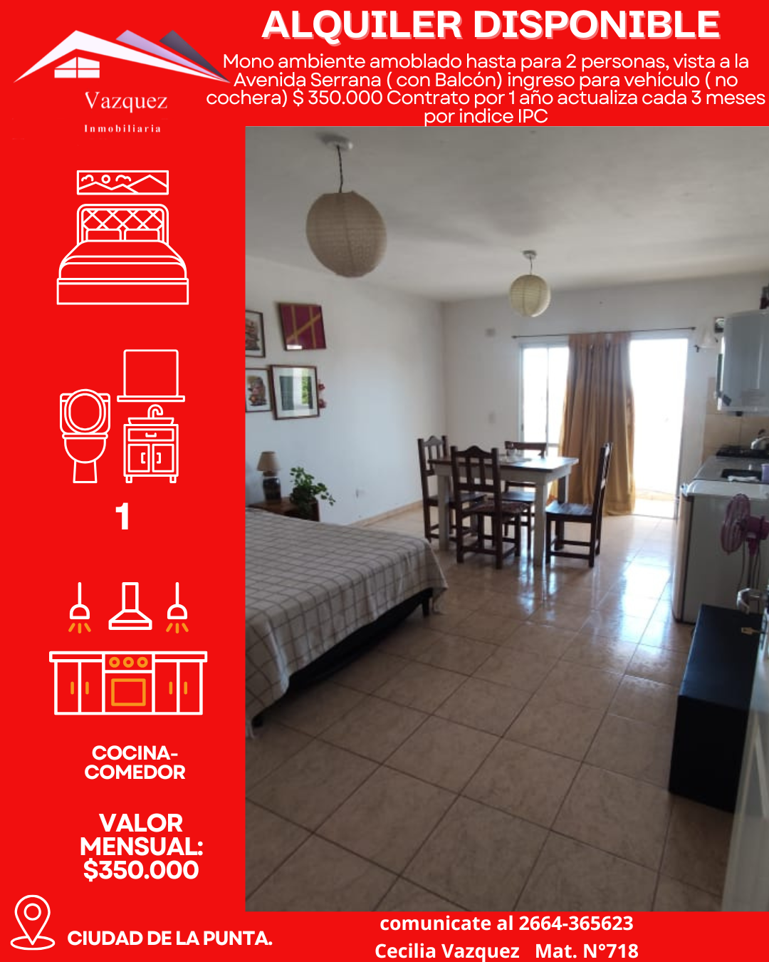 DISPONIBLE EN ALQUILER Mono ambiente amoblado hasta para 2 personas, vista a la Avenida Serrana ( con Balcón) ingreso para vehículo ( no cochera) $ 350.000 Contrato por 1 año actualiza cada 3 meses por indice IPC.